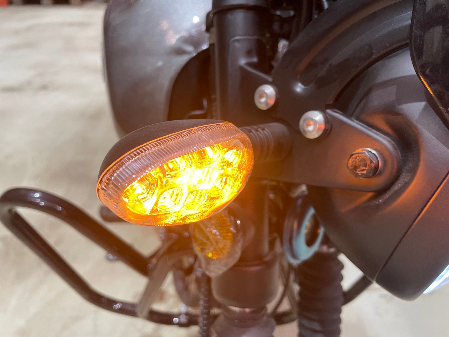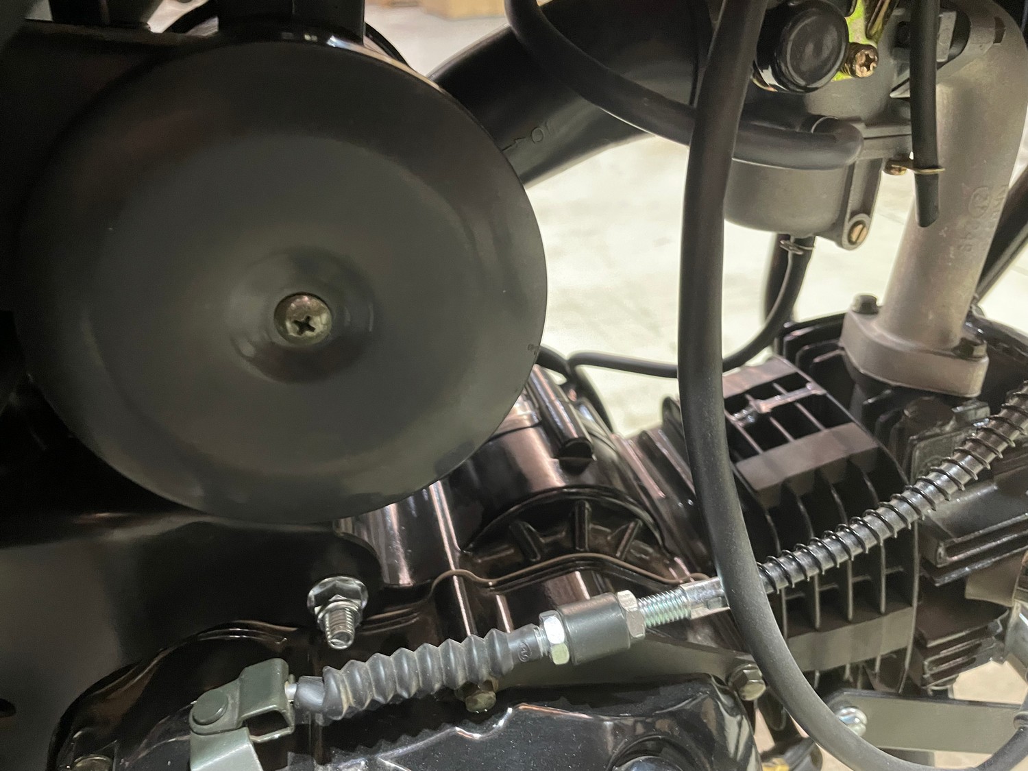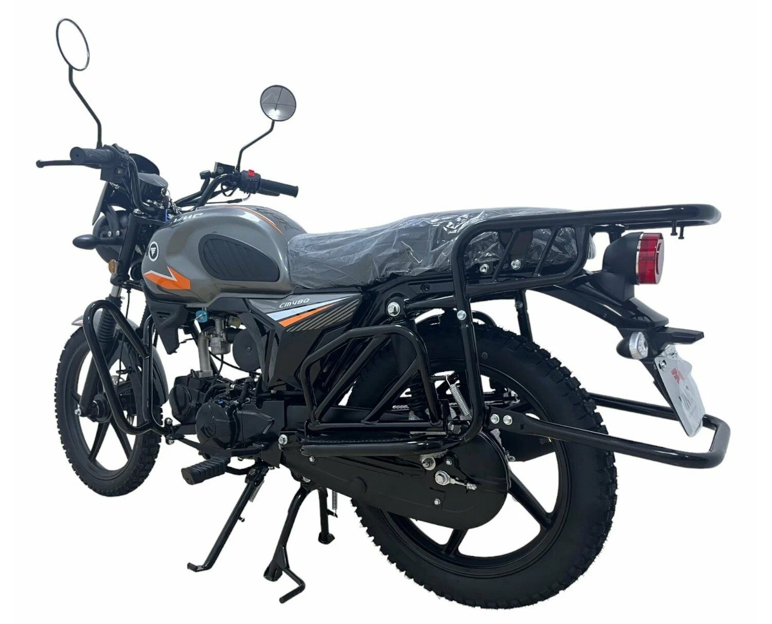 Мопед оснащён колёсами размером 2.5×17 дюймов спереди и 3.0×17 дюймов сзади, что придаёт ему отличную устойчивость и манёвренность на дороге. Тормозная система сочетает передние дисковые и задние барабанные тормоза, обеспечивая эффективное и безопасное замедление. Привод осуществляется через цепь 428 с 104 звеньями, позволяя развивать максимальную скорость до 100 км/ч.