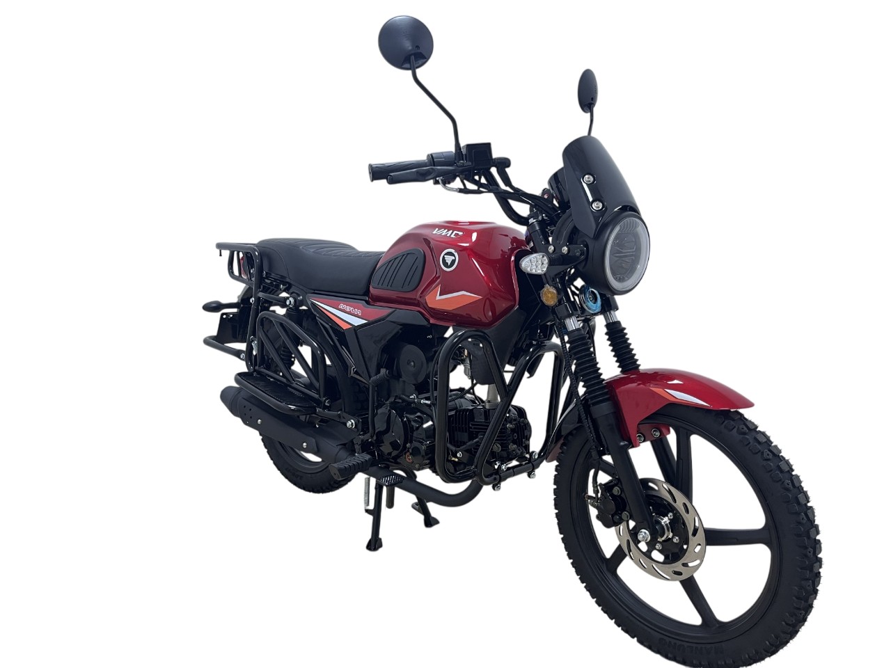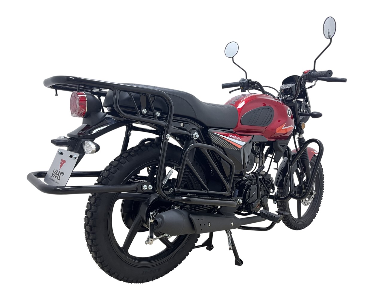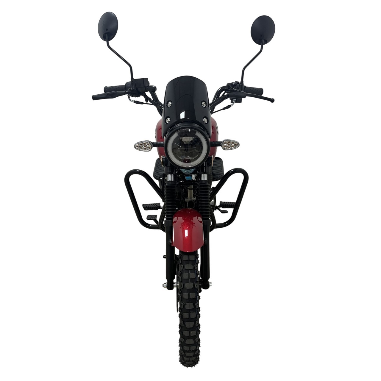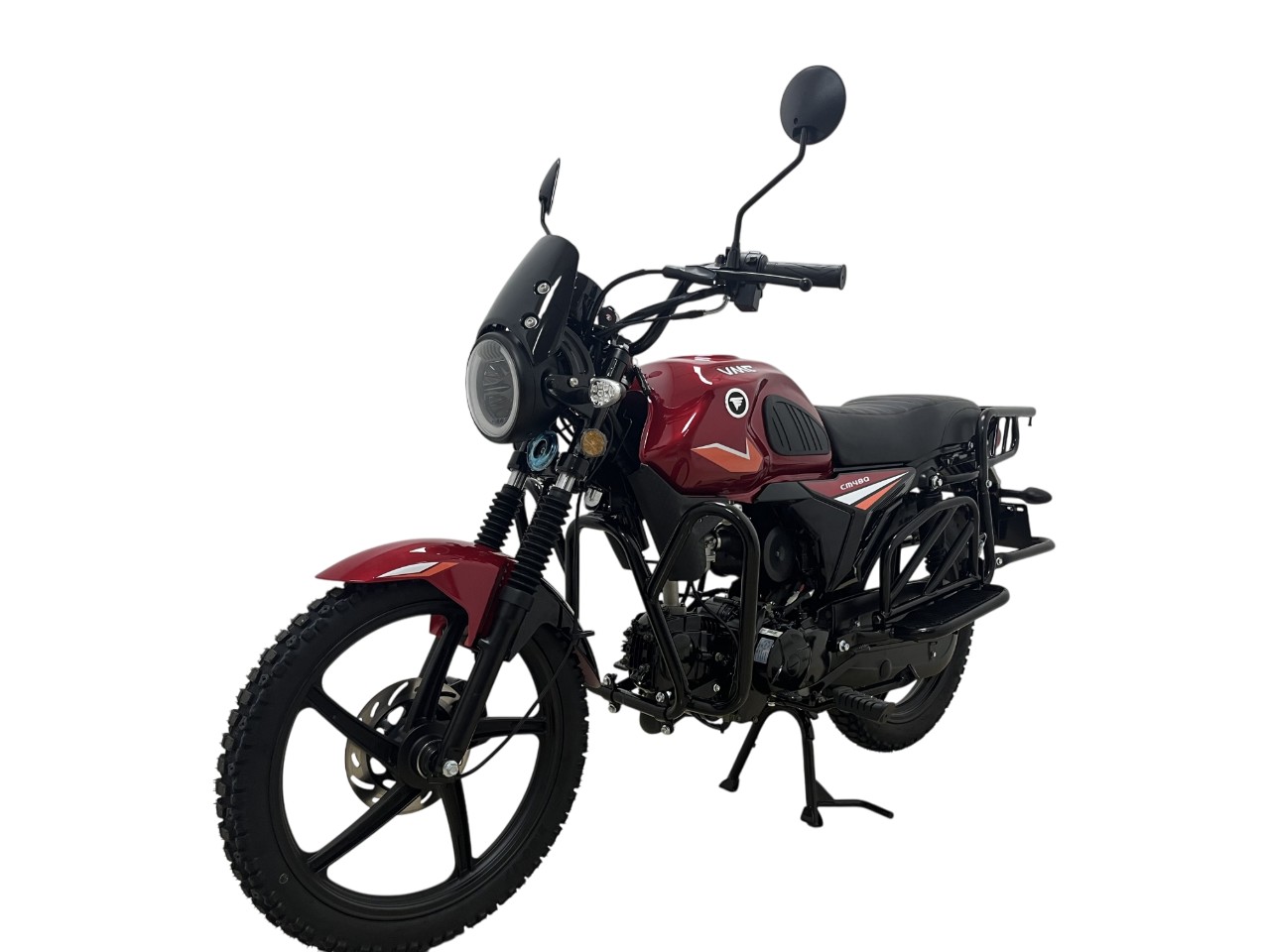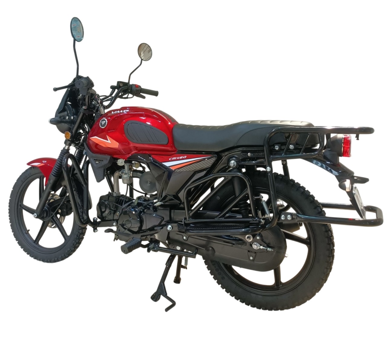 Мопед оснащён колёсами размером 2.5×17 дюймов спереди и 3.0×17 дюймов сзади, что придаёт ему отличную устойчивость и манёвренность на дороге. Тормозная система сочетает передние дисковые и задние барабанные тормоза, обеспечивая эффективное и безопасное замедление. Привод осуществляется через цепь 428 с 104 звеньями, позволяя развивать максимальную скорость до 100 км/ч.