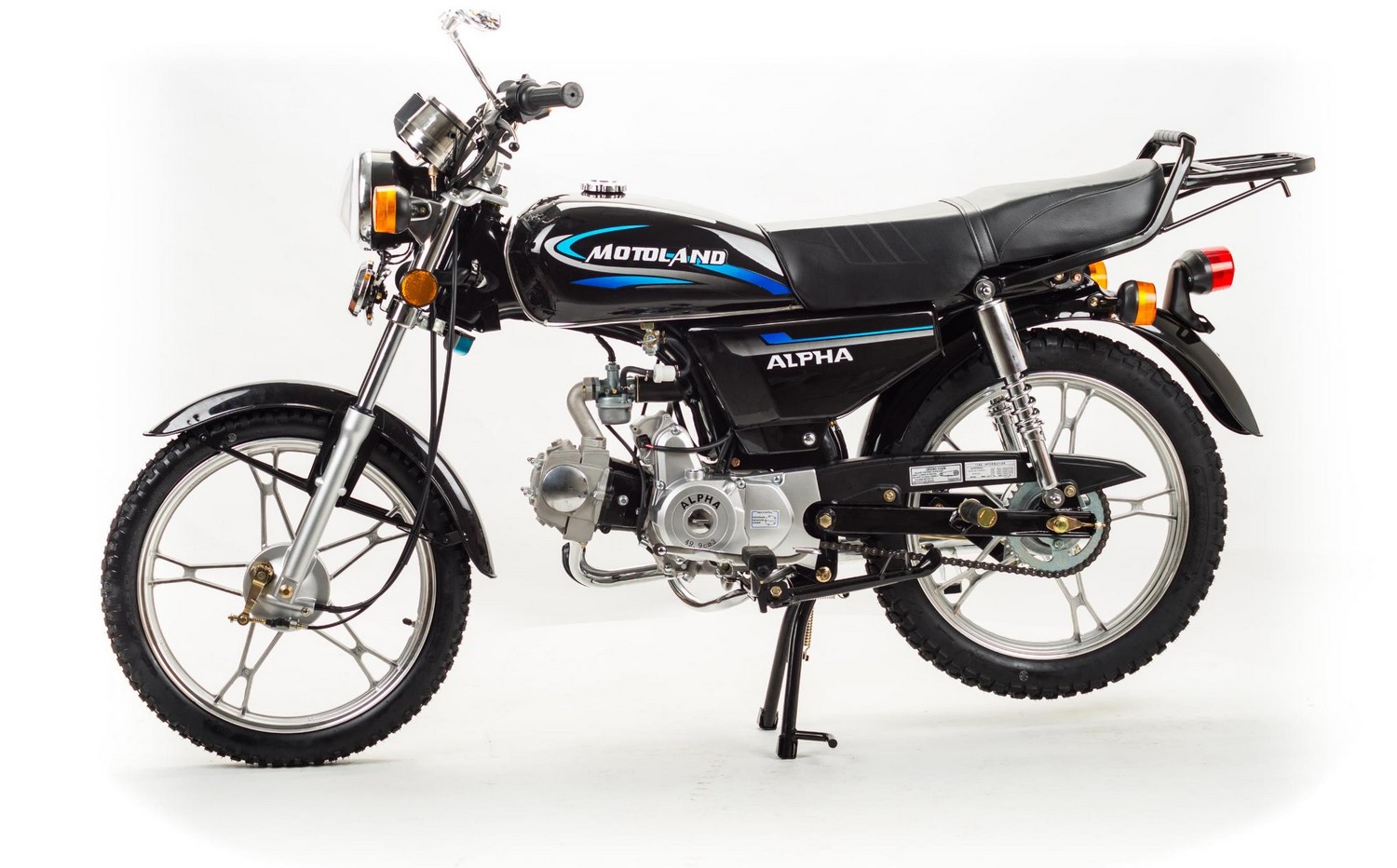 Мопед Motoland Alpha 11 Black (15370) - это выгодный вариант для жителей сельской местности, которые могут использовать его для поездок на рыбалку и в ближайший магазин. Максимальная нагрузка: до 150 кг. Вес - 80 кг. Технические особенности: стальная трубчатая рама сварного типа - экономичный одноцилиндровый четырехтактный двигатель (5 л/с, 110 см3) - карбюратор PZ16 - электростартер / кикстартер - воздушное охлаждение - механическая КПП (1-N-2-3-4, многодисковое сцепление в масляной ванне) - телескопическая вилка и два усиленных задних амортизатора - барабанные тормоза спереди и сзади - литые колесные диски - пластиковая защита цепи - багажник - зеркала заднего вида - передняя фара - электромеханическая приборная панель - стоп-сигналы и поворотники - звуковой сигнал
